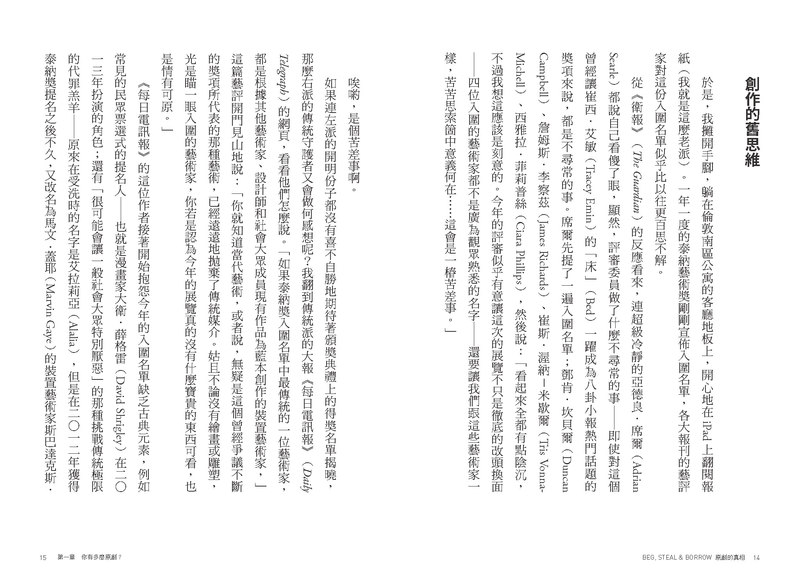 關於本書 「藝術就是賊!」畢卡索曾經如此公開聲明,而大部份原創的新藝術品,大多也是如此:一個〈或兩個〉明確、公然的竊盜行為。然而,儘管從來沒有任何一個時代比我們現在這個網際網路時代還要更容易取得並複製圖像,但是與藝術借用相關的法律卻是限制愈來愈多,也引起愈來愈多的爭議。 勞勃‧蕭爾從各個不同的角度來觀察藝術借用行為,追溯從米開朗基羅一路傳承到傑夫‧孔斯的藝術世系,更別說還有法律爭議史上的例證:從十六世紀阿爾布雷希特‧杜勒控告盜版畫家,到近代理查‧普林斯和米老鼠經歷的艱辛。 《原創的真相》一書是一份會挑起爭議的調查,探索一個關聯性勢必愈來愈廣泛,也勢必愈來愈重要的複雜主題。 談及原創與抄襲,他們這麼說: 「二十一世紀的剽竊與著作權官司,與二十世紀的猥褻官司如出一轍。這真的是我們這個時代的問題。」——肯尼斯‧ 哥德斯密 「給我站住!你們這些狡詐之徒,又不是作品的主人,卻竊取別人的大腦!不要再痴心妄想把你們的髒手偷偷摸摸地放到我的作品上!」——阿爾布雷希特‧ 杜勒 「原創無非只是審慎的模仿罷了。」——伏爾泰 作者簡介: 勞勃‧ 蕭爾,著有《廣告的十大原則》(10 Principles of Advertising)、《後攝影》 (Post-Photography)以及研究英格蘭中部米德蘭地區歷史、儀式與民俗的《中部大震撼》(Bang in the Middle)等書。他的博士論文主題是沒有鼻子的偉大桂冠詩人威廉‧達文南特爵士(Sir William Davenant)和英國歌劇的起源。他目前是現代藝術與視覺文化雜誌《大象》(Elephant)的編輯。 譯者簡介: 劉泗翰,資深翻譯,悠遊於兩種文字與文化之間,賣譯為生逾二十年,譯作有《非虛構寫作指南》、《這不是英語》、《陌生人的孩子》、《愛的哲學課》、《沒有我們的世界》、《四的法則》、《卡瓦利與克雷的神奇冒險》、《喂,有人在嗎?》等四十餘本。
