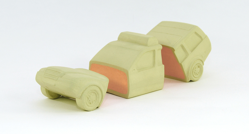 coloured stoneware (pastel:light blue, light yellow-green, dark grey) 30x19x18(H) cm