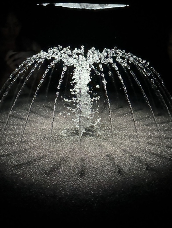 《雙螺旋》在平行視角下清晰呈現螺旋造型,令人聯想到DNA與生命週期,也象徵展場入口的「好奇旅程」起點。作品由單一鋼管彎曲而成,透過馬達驅動,一半緩慢上升、另一半徐徐下降,營造無限循環的動態感。它並不強調寓意,而在於「運動本身」:觀者在移動與換位中,不斷看到螺旋交錯重疊。雖然雕塑位置不變,但在光影投射下,地面卻出現層層交織的同心圓,展現動與靜、形體與陰影的張力。這種循環與落差,使觀者意識到「所見」與「所感」之間的差異,也令人連結到我們參與的「旅程」與「好奇」,是奧拉弗.埃利亞松帶給觀眾一場對世界探索、觀察,自我對話的延續性思考。